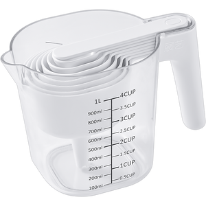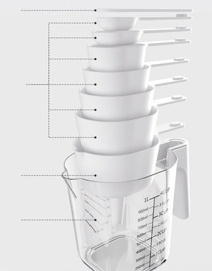 Versatile and space-saving, this multifunctional measuring cup set is a must-have for any kitchen. Made with safe and durable PP material, you can confidently measure and mix ingredients for your culinary creations. The set includes a measuring cup, funnel, scraper, and 6 different sized measuring spoons, giving you a wide range of options for your baking and cooking needs. Plus, the convenient double-sided scale allows for precise measurements and easy stacking for storage.
