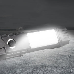 This multifunctional flashlight has 8 features including an emergency hammer, rope cutter, strong light function, mobile phone charging, desk lamp function, magnet adsorption, single switch operation, and USB charging. It is durable, waterproof, and can be used for various activities such as hiking, camping, and self-defense.