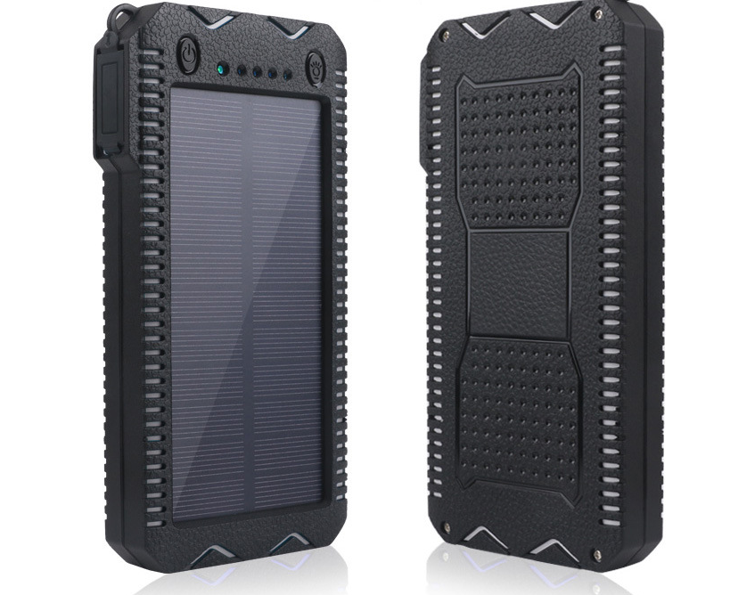 Material: plastic shell, Dimensions: 164.5*81*22, Color classification: 4 colors, Type: Universal power bank, Indicators: 5 lights, 1 for solar charging, 4 for battery, Functionality: dual flashlight, cigarette lighter, Waterproof and durable, Solar panel: 1.2W, Battery: lithium polymer, Non-slip silicone design, Dual LED lighting, USB output for portable charging.